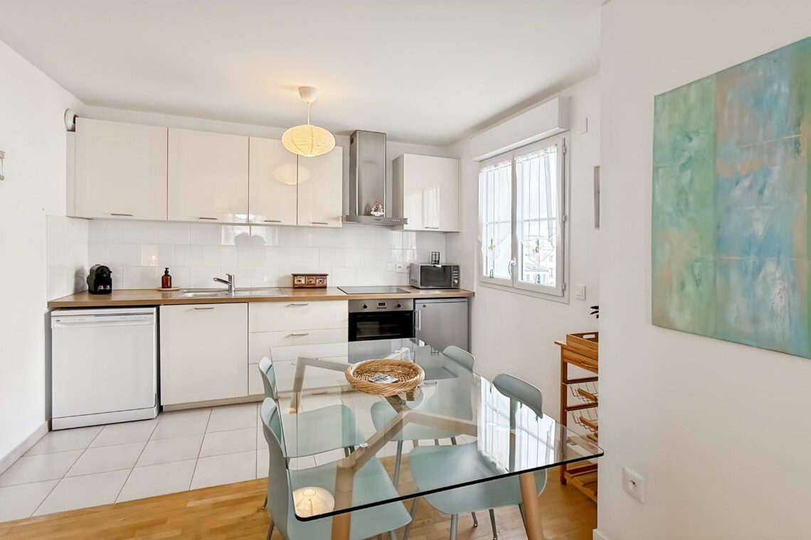 Plaque induction, four, hotte décorative, micro-ondes, réfrigérateur/congélateur, lave-vaisselle, cafetière Nespresso, bouilloire, vaisselle et couverts, ustensiles de cuisine…